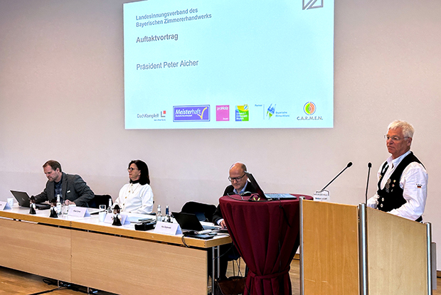 Präsident Peter Aicher informierte über die Aktivitäten des Landesinnungsverbands. Thematisiert wurden die Nachwuchsförderung, Öffentlichkeitsarbeit, strategische Verbandsentwicklung sowie Forschungs- und Innovationsprojekte im Holzbau.